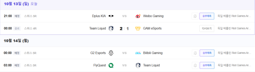 스위스 5라운드는 13일 9시부터 시작해서, 14일 새벽 3시에 종료됩니다. 이 경기로 8강에 진출하는 팀들이 결정됩니다.